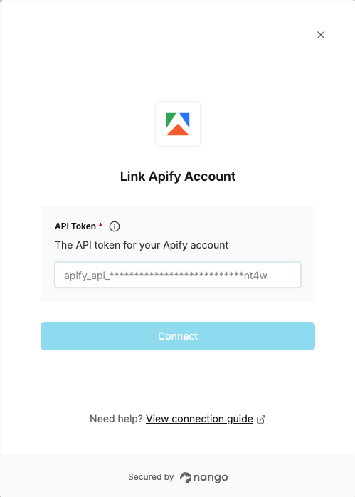 To authenticate with Apify, you need:- API Token - A token that grants Nango permission to interact with Apify’s API resources and services.